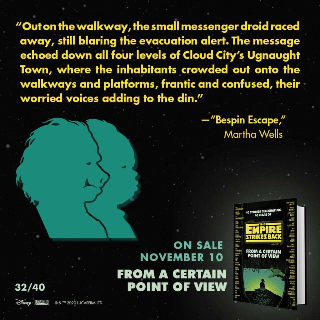 On to Cloud City and many versions of Lando Calrissian’s “Attention, the Empire has taken control of the city…” announcements. Seriously, it is in every story revolving around Cloud City, though it is fun listening to the audio and each narrator’s interpretation of the announcement. Bespin Escape by Martha Wells is the fifth story from Cloud City and the first to focus on Ugnaughts. Those who read canon materials know that the species, which has seen more mainstream recognition from The Mandalorian, had large populations living in Cloud City so it was likely we would get a story from one’s perspective. In this story, it is from the perspective of Lanasti (not sure if that is the correct spelling as I listened to the audiobook) who is awaken by a family member to the realization that the Empire has taken control over Cloud City. Lanasti has predicted this outcome, having intercepted Lando’s personal communications, and had tried to warn her family that they needed an exit plan but her family refused to listen. Even when the moment to make a decision has fallen upon this family (which includes uncles, aunts, and cousins) they are still brushing off Lanasti’s advice. It is a family argument with the highest stakes and might mirror many arguments that have occurred in history at the moment when families have decided to leave their homeland for another. Bespin Escape is a reminder that the Empire invading Cloud City has dire consequences for certain species and, for the Ugnaughts, that consequence is slavery. And because of that, you are more invested in their escape and curse the obstacles that get in their way. I know Martha Wells wrote the legends novel Empire and Rebellion: Razor’s Edge and has the popular The Murderbot Diaries series but would love for her to write another novel focusing on species like Ugnaughts navigating Imperial rule.