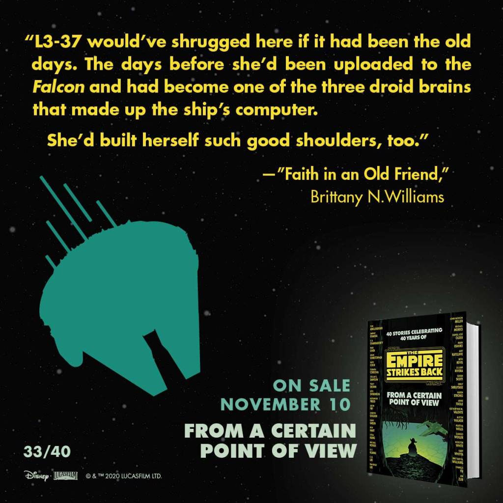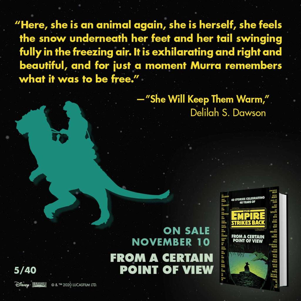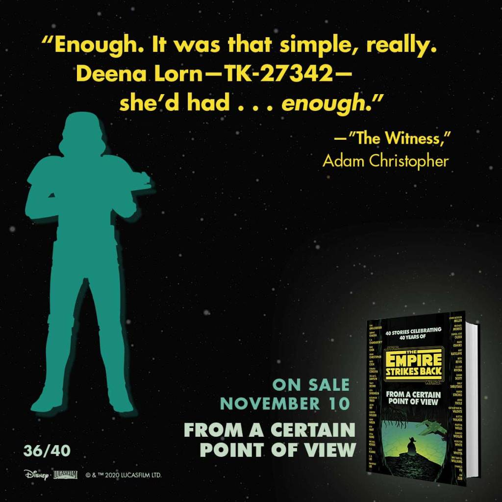 None of these authors return for Empire but we have a handful of high-profile new authors, including R.F. Kuang and Martha Wells. Some of the same issues that were present with the first collection of short stories are present here: even though there are many different points of view, they are around the same event, which gets repetitive, especially since the stories are grouped by sequential events in The Empire Strikes Back. The events/locations that are covered in this collection are 1) Escape from Hoth, 2) The Search for the Millennium Falcon, 3) Luke’s time on Dagobah, and 4) Cloud City. Also, some of the humor in certain stories seem out of touch with the character and situations and out of touch with Star Wars humor. This comes with the territory of having different voices writing, some authors just get it and fit the perfect tone for Star Wars, and some don’t. There’s more good than bad here and even some outstanding additions to the canon. Here are my top ten best character stories from A Certain Point of View: The Empire Strikes Back in order of event sequence.