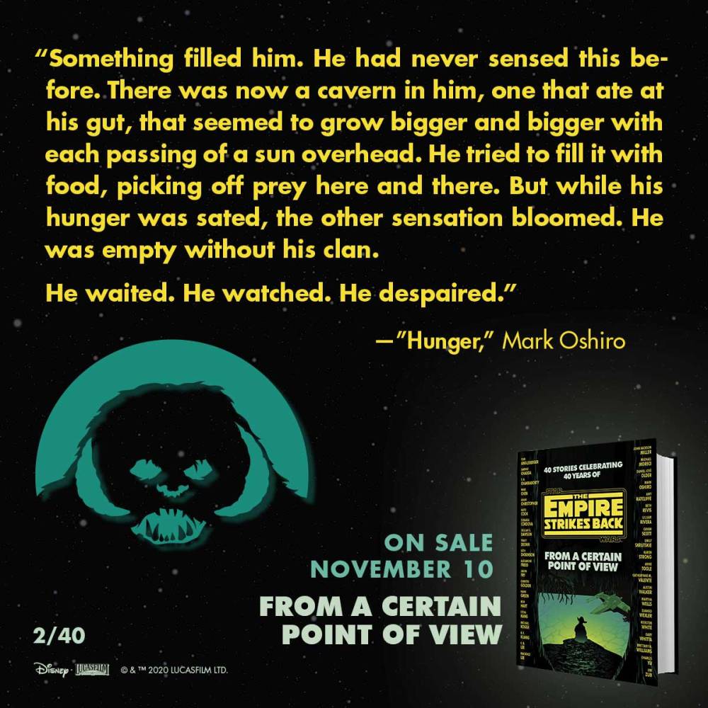 Many iconic things in Star Wars are introduced to us when we first visit Hoth in The Empire Strikes Back: the icy landscape, the uniquely designed probe droids, AT-ATs, and creatures. All play a part in the stories in the first half of A Certain Point of View and one of the most compelling stories involves a Wampa. The protagonist in Hunger is an unnamed Wampa who bears the responsibility of keeping his clan safe and flourishing in the unforgiving Hoth environment and faces the harsh reality that he is not the most threatening creature on the planet when the Rebellion decides to set up base in his territory. Such is the case when animals, living their lives, get caught in the crossfire of colonization and wars. And Hunger is a reminder that creatures in the Star Wars universe struggle with the light side and the dark side as the Wampa warrior goes through hunger for sustainability and hunger for revenge.