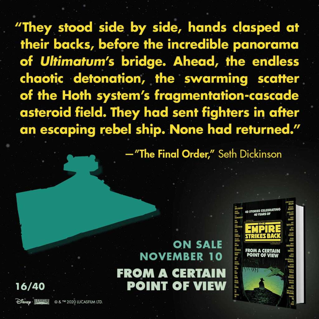 From A Certain Point of View shines the most when it takes blink-and-you’ll-miss-them characters from the film and gives them a story so poignant that you’ll wish you had more time with them, even when you know you don’t. The focus of The Final Order by Seth Dickinson is an Imperial Bridge Office we learn to be Captain Canonhaus. And you could certainly miss this character in Empire if you blink. The Imperial Fleet is stationed outside of an asteroid field where they have traced the Millennium Falcon and are losing ships to asteroids and debris. Canonhaus is the officer that is on a hologram with Vader and is killed by an asteroid that hits his command deck…and Vader and the other officers just keep talking, not even acknowledging Canonhaus’s death. In The Final Order, we see the time right before that communication when Canonhaus is mostly involved in a conversation about the Empire with his subordinate, a young promising Cadet. The story is a mixture of what he wants to say to this young leader and what he actually says: part of which is understanding the difference between the idealism the Empire presents itself to be, and the reality of what it is. What exactly is it? Canonhaus believes it is a tool to enable people like Darth Vader to do anything they want. He gives the Cadet an example of his part in destroying an Alderaanian refuge convoy and purposely misfiling paperwork. No one cared or ever said anything because the Empire doesn’t care about rationalizing evil acts.