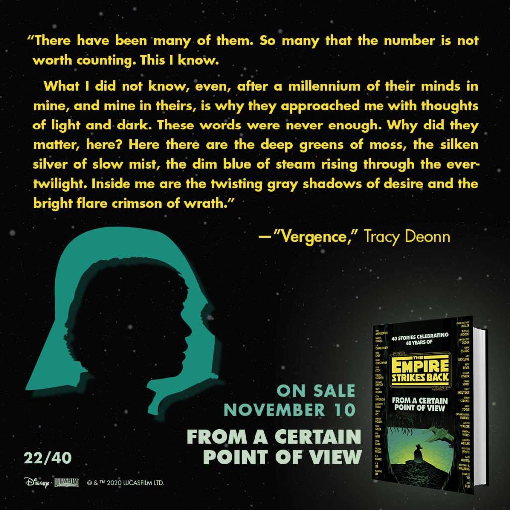Vergence by Tracy Deonn is probably my favorite story in From A Certain Point of View, which I would never expect to say about a story that revolves around the Cave of Evil on Dagobah. We are given very little information about it in Empire Strikes Back, though we do see it in The Clone Wars as Yoda meets it for the first time. But here, we get its’ thoughts as it evolves through time and interacts with our main characters from the film. The Cave of Evil is an entity that is at least a thousand years old and chapters its’ evolution as Understandings (there are five Understandings total). It is quite similar to an AI’s journey to self-actualization, through interaction with beings like Qui-Gon, Yoda, and Luke. Because the Cave is a dark side entity, this allows for insight into Yoda’s thoughts and his dance with the dark side, his shame and regrets from his time on the Jedi Council. The Cave of Evil is on the list of these almost ethereal force beings, along with the Bendu from Rebels and The Priestesses from The Clone Wars. Characters that have a lot of questions surrounding their existence and are perfect for these types of short stories.