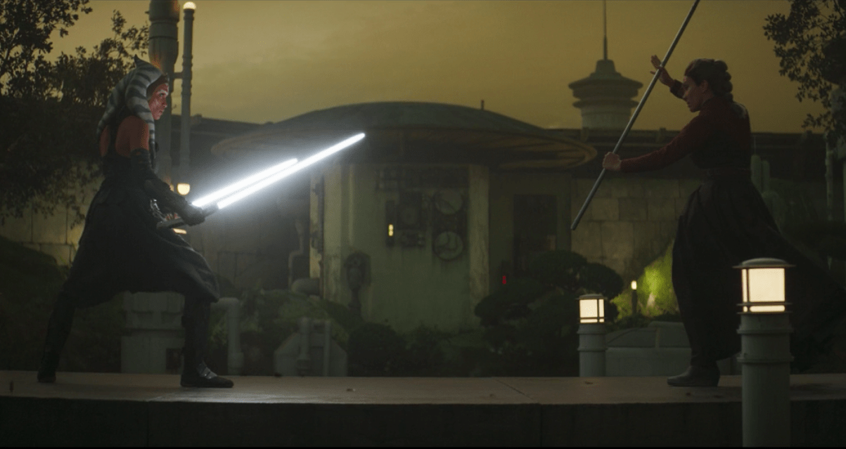 Speaking of epic, the opening scene was great to watch but the ending fight (both Mando’s stand-off with the hired gunfighter and Ahsoka’s battle with Elsbeth) was truly special in their own ways. The scene between the gunfighter, played by action legend Michael Biehn, and Mando was tense as the gunfighter was trying to negotiate his way out of the stand-off and sneak in a surprise attack. It doesn’t work out well for him and Mando once again takes a back seat to the main fight after last week’s canyon escape. On the other side of the wall, it was nice to see a lightsaber fight even if it was against a Beskar spear in the faster-paced fight between Ahsoka/Elsbeth. Elsbeth is an interesting character that knows a lot about Mandalore and might have connections to it given the fact that she even has a Beskar spear. Perhaps one of the worlds she stripped of resources was Mandalore, which might also mean that she knows Moff Gideon. And of course, speaking of the Moff himself, I was expecting to see him in this episode. The setup of him showing up on Corvus looking for one Jedi and finding another was there, but it was a nice surprise that we didn’t go that direction and got some proper time with Ahsoka. I now think Gideon might show up again in the season finale.