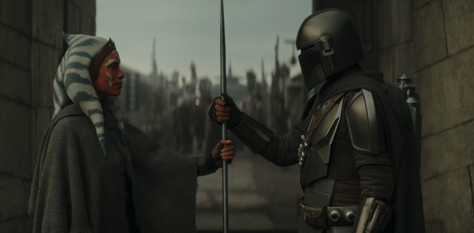 Given the fact that Disney never actually confirmed that Ahsoka Tano was going to be in this season or that Rosario Dawson was playing her, we were never really sure how many episodes she would appear in. As we got into the season, there were rumors that it might just be one episode so, if those were true, then I could bet on two things: Dave Filoni would be directing that episode and he would make it count. Both were true but I didn’t expect to see her in the opening scene and for that scene to be an action-heavy one. Right away. Right away we see that she has her own battles she is fighting, externally and internally (but we’ll get to that later) and has a worthy yet cold opponent in Morgan Elsbeth who makes it clear that she will leverage the citizens of her town to keep Ahsoka in check. She is a survivor of the Clone Wars (like Mando himself) that went into business with the Empire, helping to exploit worlds for their resources. And Ahsoka needs to get some information from her, which is made clear in the first five minutes of this episode as she destroys hired guns and gives Elsbeth one day before walking off into the mist like a boss. Again, first five minutes. Epic.