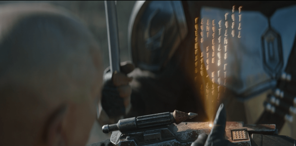 Mando and Cobb Vanth: In the first episode of season two, Chapter 9: The Marshal, we meet Marshal Cobb Vanth. Vanth is a character from the Aftermath Trilogy who acquires Boba Fett’s armor. When Mando first meets Cobb, he is wearing Fett’s armor and Mando thinks he has finally found someone who can lead him to a Jedi. This is instantly shattered when Vanth takes off his helmet and you can see Mando’s incredulous face, even if you can’t see his face. Vanth makes it clear to him, and us that he isn’t actually a Mandalorian (which Mando already knows with conviction). He tells Cobb to surrender the armor or have it removed before they get interrupted by the episode’s antagonist; however, by the end of the episode, Mando comes to respect Vanth and his efforts to protect the citizens of his town and works with him to defeat the Krayt dragon. It is not said, but you get a sense that Mando feels that Vanth has earned the right to wear the armor of a Mandalorian. But he still takes it in the end.