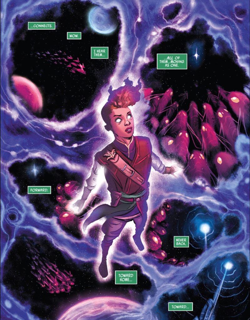 For characters, if you have read Light of the Jedi, you are certainly familiar with Master Avar Kriss and Master Sskeer. If not, there are subtle lines that give comic readers a sense of personalities. Avar still comes across as flat but expecting that she will be a big part of this run as well so room for more development. It is a nice introduction to the personality of Jedi Keeve Trennis – a nervous talker who tends to curse a lot but is well meaning. She also seems to have more of a connection to creatures as she uses the force to figure out why the insects are traveling off their migration pattern. Her double-bladed lightsaber is also pretty awesome. We also meet Estala Maru, a Kessurian Jedi Master, who is aboard the beacon and helps Trennis save the Ximpi city. Sskeer also appeared at the end of A Test of Courage, giving advice to Jedi Knight Vernestra Rhow on choosing her Padawan. It will be interesting to see if they further explore his relationship with Keeve Trennis as she moves on within the Jedi Order or if he will continue to close himself off.