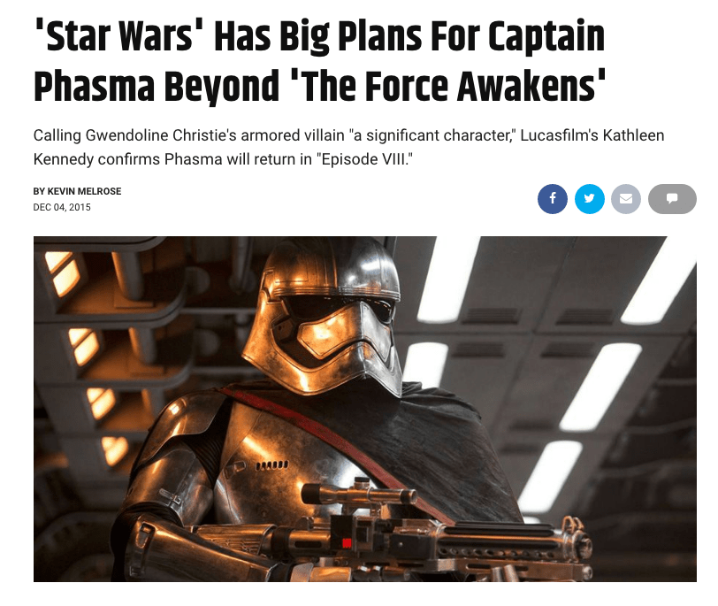 This, even though Episode VII was in the books and both Christie and Kennedy knew that Phasma was absolutely about to have a Boba Fett in the Sarlacc pit moment. Other outlets picked up on this and built up the hype even more.