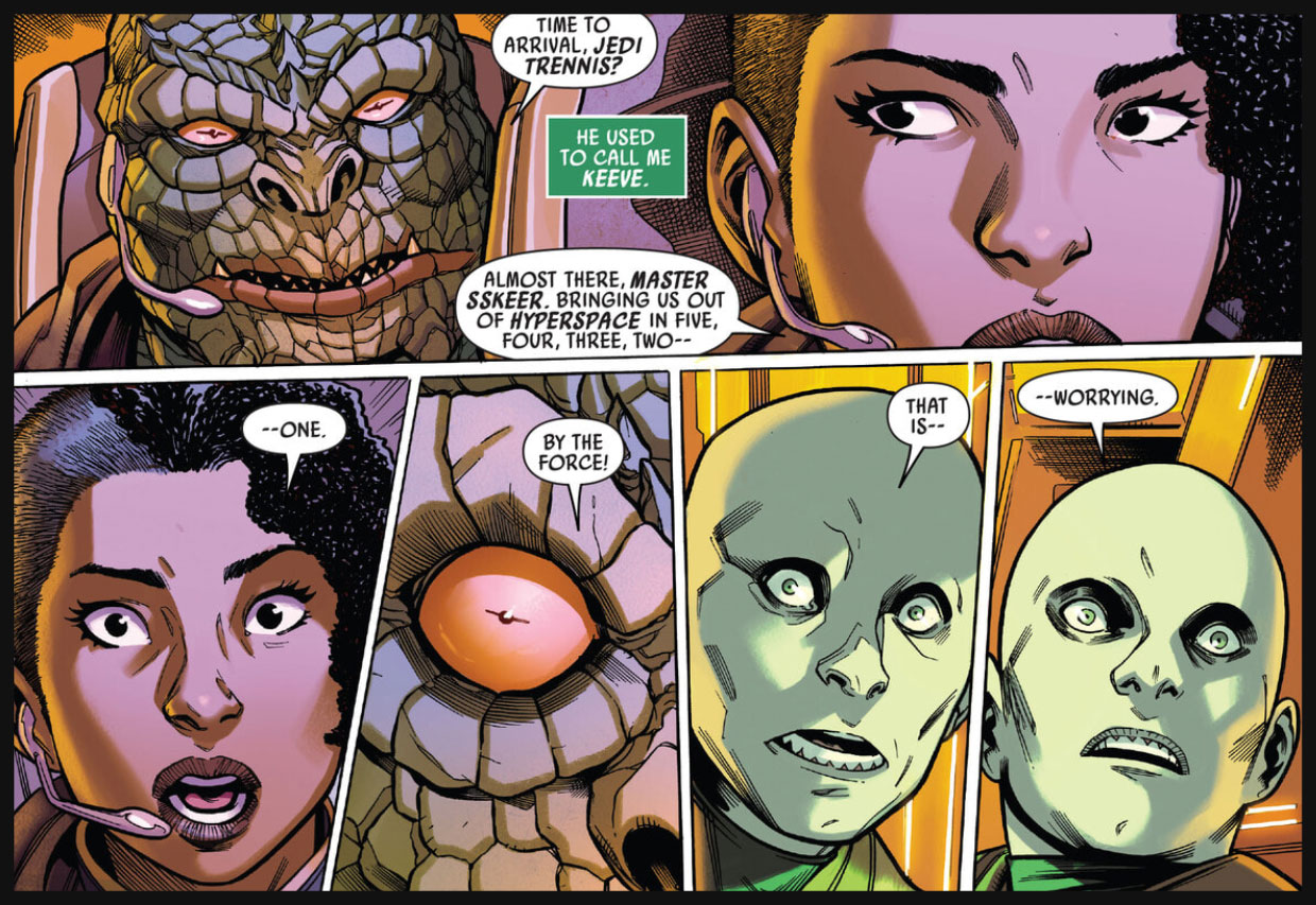 At first, when I read The High Republic #1, I thought that having Keeve Trennis complete her Jedi trials in one issue might be moving too quickly. It was the first time, as a reader and watcher of the films, seeing a Jedi trial instead of hearing about it and I was a little disappointed that it didn’t spread out over multiple issues. However, after reading the second issue, Keeve being a newly knighted Jedi makes a far more interesting challenge of learning what that means…and also dealing with losing a connection with her former Master Sskeer.