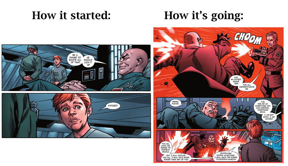 Hux is ambitious and spiteful and channels those two traits toward getting ahead and getting revenge. In the Age of Resistance one shot, he used a radar tech’s error in his ship’s maintenance as an excuse to execute his commanding officer, General Brooks, who treated Hux poorly as a child. It’s what led him to have his father killed and spying for the Resistance to undermine Kylo Ren. He is fueled by his enemies constantly underestimating him so it would fitting to also have Pryde and Palpatine underestimate him.