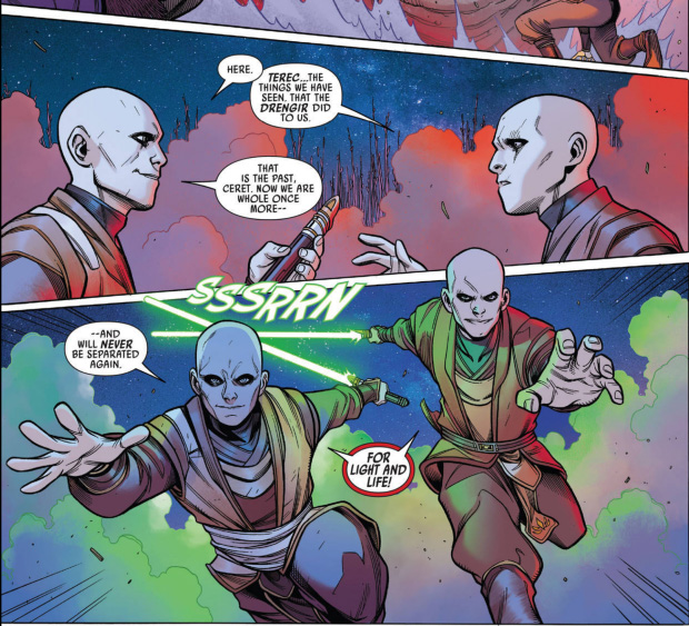 We also learn why Sskeer has seemed more disconnected and it turns out that Avar Kriss not being able to hear Sskeer’s song in issue #1 was an important line as Sskeer confesses to Keeve that he is losing his connection to the force. This might be due to his unresolved trauma from Light of the Jedi or the Drengir but it presents another hurdle for the poor Trandoshan Jedi Master. It is also a touching moment of vulnerability for Sskeer, confiding in Keeve and seems to be an important shift in their relationship. Ceret and Terec seem to be back to their old selves and it is good to see that both are ok. But no one is out of the woods yet as they will still have to deal with Hutts and their territorial claims in the coming issues. And the Drengir are still out there, broken but not defeated.