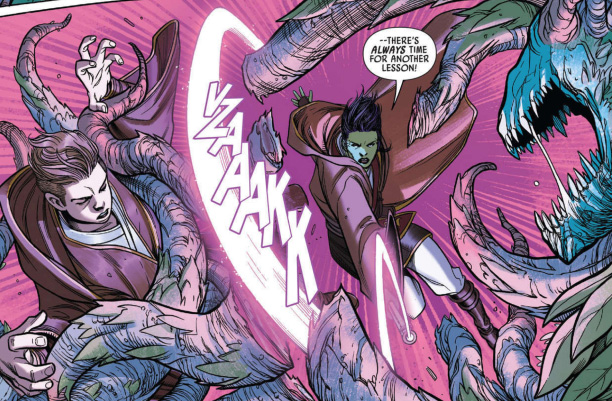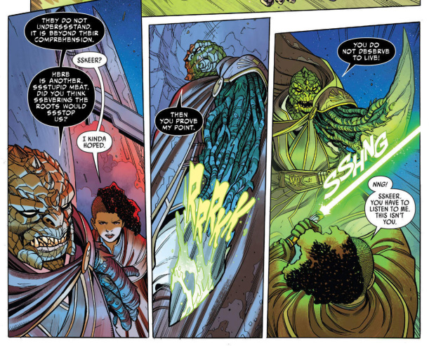 Sskeer manages to break free of the Drengir control long enough to tell Keeve that she must convince the Drengir that they, the “meat”, is rotten and will infect them so they back off. Keeve seems to have a specialty in communicating with creatures (as she did with the Ridadi in issue #1) and this proves to work. Keeve force-communicates with the Drengir and convinces them that they are all contaminated and the plant monsters retreat on Sedri and on Starlight…but potentially at a cost for Sskeer.
