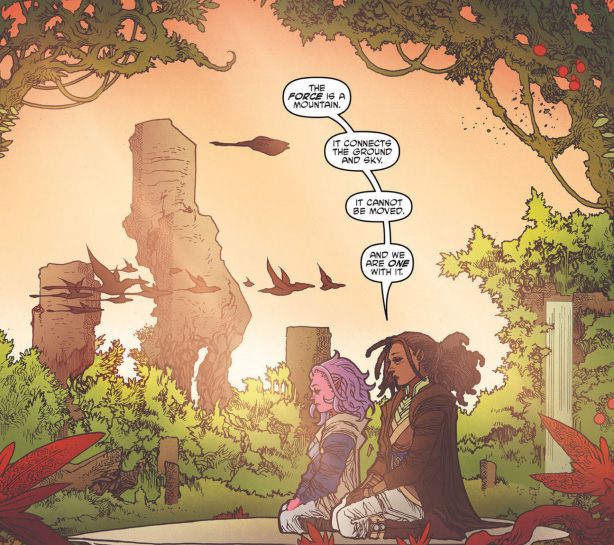 It doesn’t take long to connect the title to the theme of The High Republic Adventures #4. On the first page, we learn that Padawan Lula Talisola understands the force as a mountain that cannot be moved and when a Jedi is one with it, everything is possible. The High Republic team said that readers would learn that each Jedi in this era sees the force as something: Burryaga views the force as a forest of trees, Elzar Mann a raging sea, and Bell Zettifar as a flaming light. Avar Kriss is an outlier as she doesn’t necessarily see the force but hears it as a song and can connect with Jedi by hearing their “songs.” Lula is trying to meditate with Zeen, whose status within the Order is still unresolved, but the girl’s mind is on her friend Krix. There is little time to discuss it because an alarm rings out on the Jedi outpost on Ord Mantell and reports go out of a possible Nihil attack, which sends Jedi Masters and Knights away, including Lula’s Master Kantam Sy, Buckets of Blood, and Yoda.