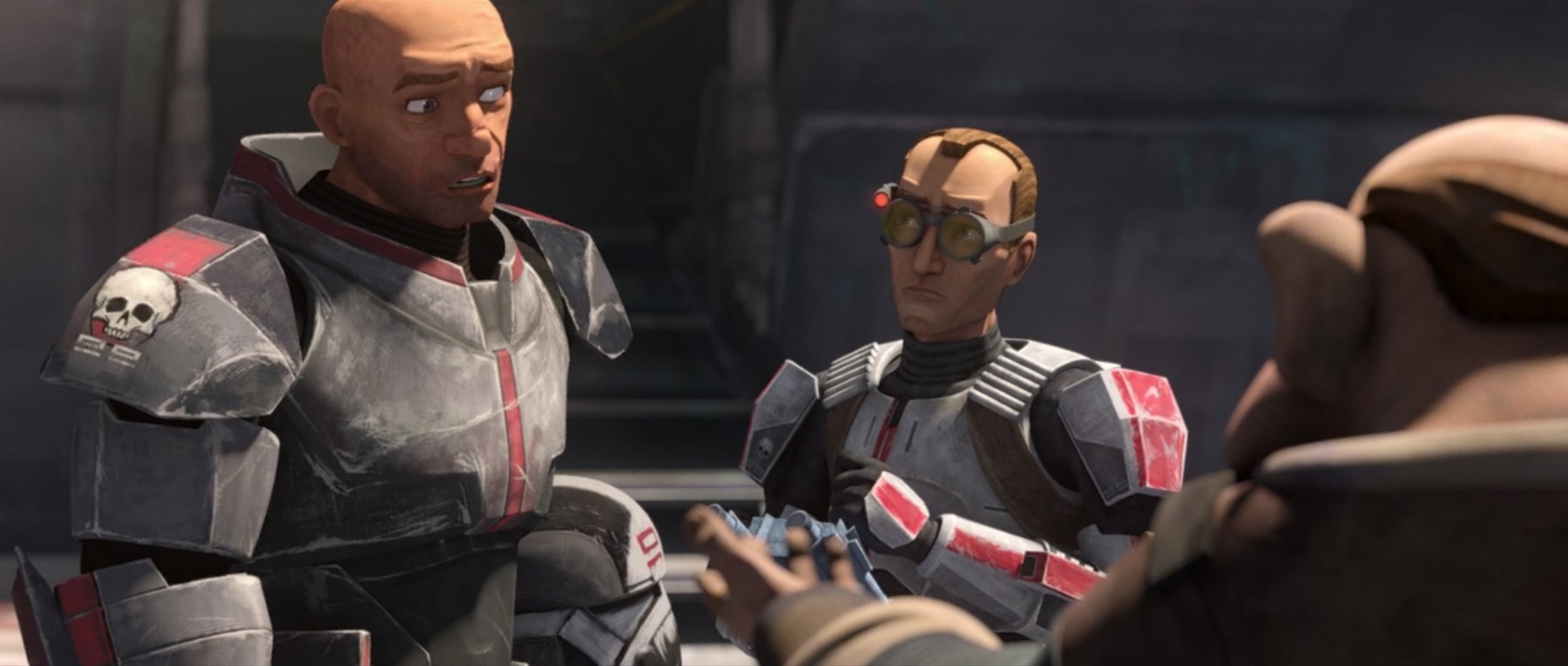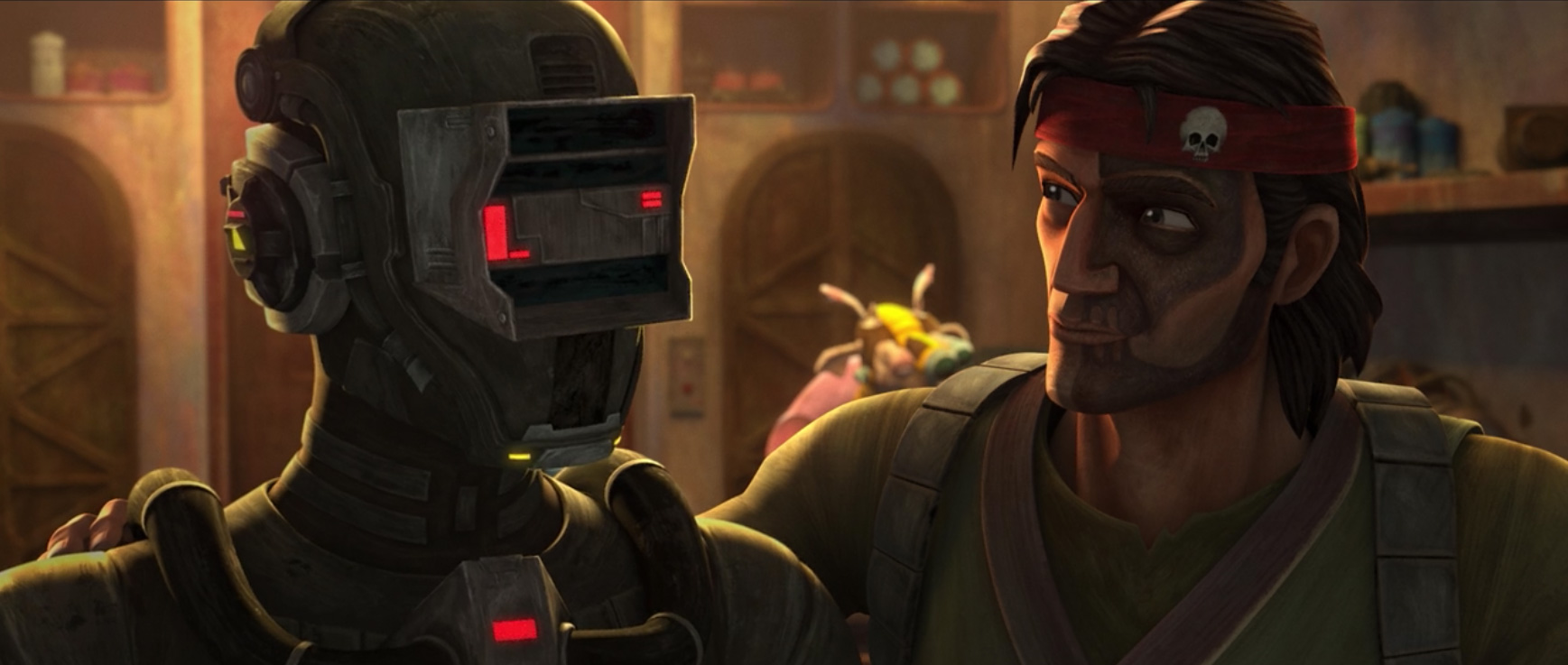 I toggle between whether this show knows what it is doing with Echo or not. The nods in each episode thus far on him being “more machine than man” are clues they do and I feel like it is going to pay off when the Bad Batch catches up with Rex but this is another episode where he is put to the side. In this episode, Echo is wearing a helmet and armor that makes him indistinguishable from a droid and, while the same vendor doesn’t want to buy Hunter’s pyro denton, he offers 2,000 credits for Echo (whom he mistakes as a droid). Echo, rightly insulted, wants to say something but Hunter stops him, realizing the opportunity to acquire some much-needed credits. Echo, hurt at the mistaken identity, says he’s worth more than 2,000 and one can’t help but feel sorry for the guy. He is also being used to cheat an honest merchant out of thousands of credits so that’s awful too.