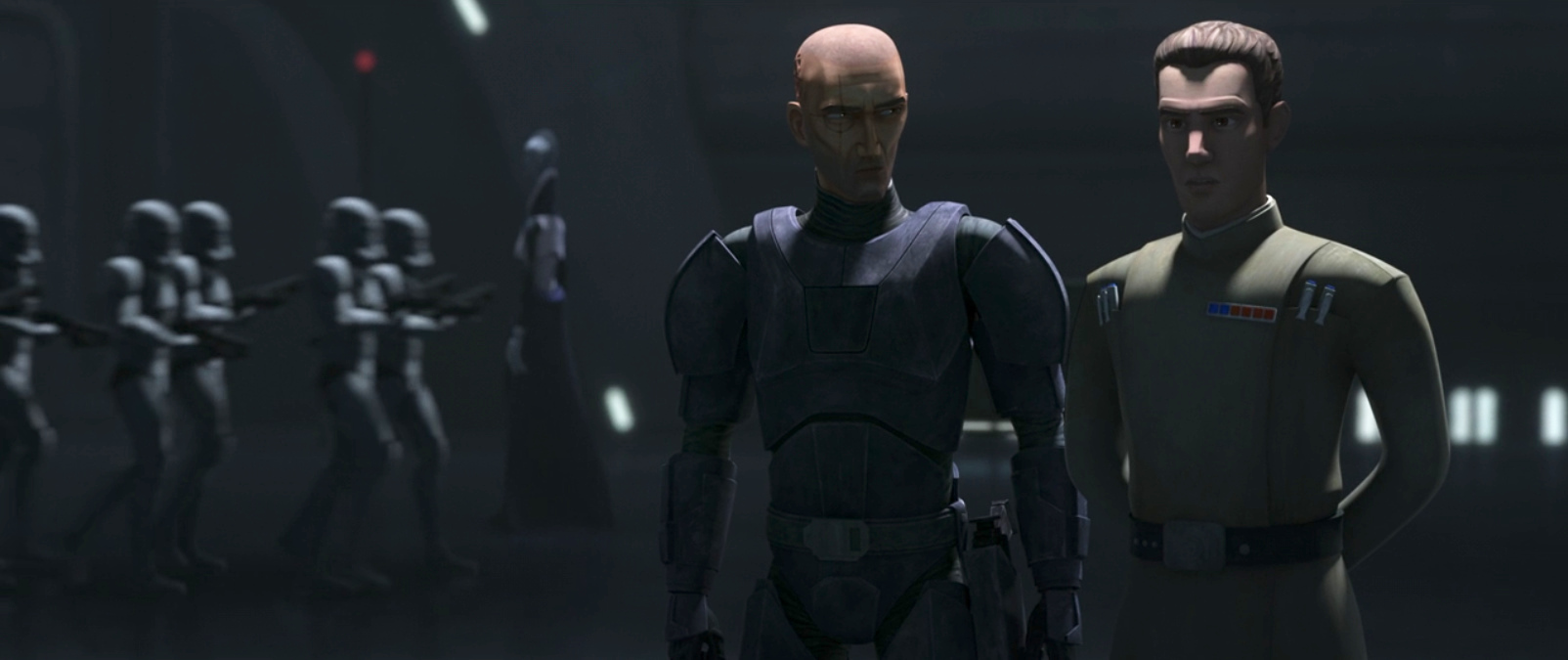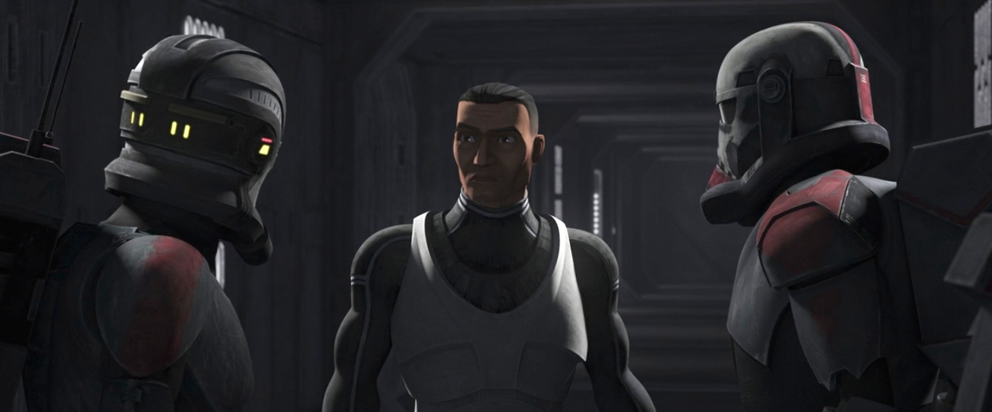 Project War-Mantle, also the title of the episode was mentioned in episode three, “The Replacements.” War-Mantle was an Imperial Project mentioned in Rogue One and in the novel Catalyst. But in “The Replacements,” we find out that it is the Imperial intention to replace the clone troopers with conscripted soldiers. And like Order 66 over the final season of The Clone Wars, that initiative has been hovering over the entire season of The Bad Batch as an inevitability. I assumed the transition would happen in a second season, but the Empire has been training replacements on secret bases, like Daro and probably other planets across the galaxy.