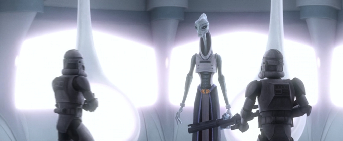 With Project War-Mantle being his design, Admiral Rampart has been undermining the Kaminoans in various ways. Now the Empire has officially canceled their contracts with the Kaminoans, and clones are leaving the facility. Lama Su, understanding that they have emboldened the Empire at their own expense, instructs Nala Se to gather medical personnel so they can depart. When Nala Se is found out, Rampart confronts Lama Su. The Prime Minister tries to play it off, ensuring that he will punish Se, but there is a twist. Rampart tells Lama Su the Empire has use for scientists, but not for a politician, and informs the Prime Minister that his services are no longer needed. The doors close, and we are to assume that Lama Su is executed.