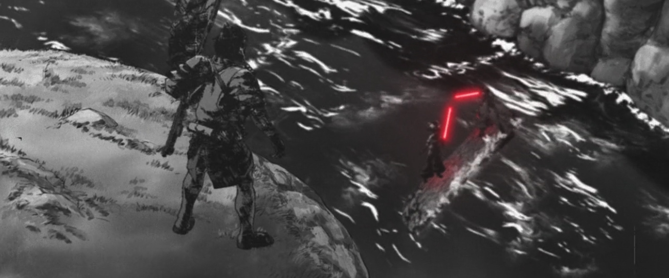 Yes, Trigger and Science SARU’s shorts seem to be lumped together and that is probably not a coincidence. But, while “T0-B1” has a more lighthearted kid-friendly approach to Star Wars that falters, “Akakiri” is a bold, dark story of a Princess and a Jedi. A Jedi, Tsubaki, travels to a distant planet to save his love, a Princess, from a Sith who has taken control of her family. Tsubaki is warned by his Master that he will fall to the dark side if he goes, but the Jedi is stubborn and insistent that he can change this outcome and save the woman he loves.