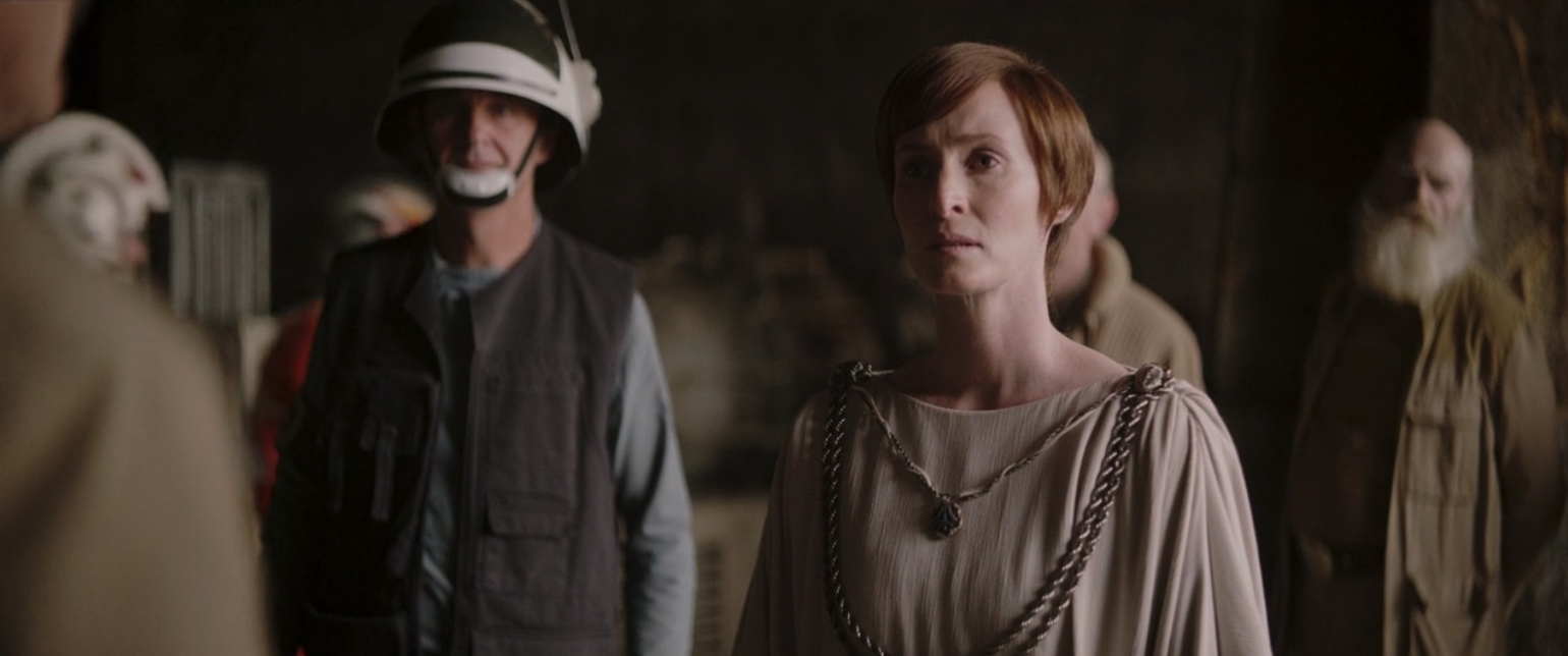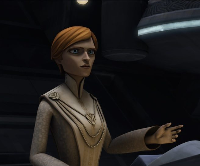 “Mon Mothma entered the room. A stately, beautiful woman of middle age, she seemed to walk above the murmurs of the crowd. She wore white robes with gold braiding, and her severity was not without cause-for she was the elected leader of the Rebel Alliance.”