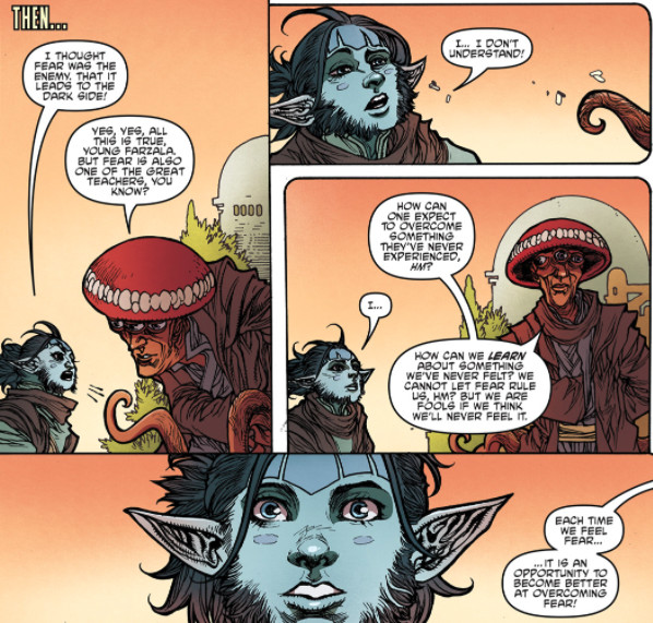While many characters appear in these two episodes (including a very familiar Hutt), the two main characters here and Farzala and his Master Obratuk. Farzala got little to do in the first six issues of The High Republic Adventures, with the focus on Lula and Zeen. In these two issues, we see his insecurities compared to his friends as he mourns fallen and missing Jedi (we learn Yoda is still missing after leaving the Junk Moon with Elder Tromak).