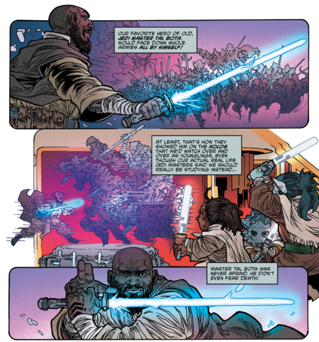 The story builds around Farzala’s perspective of his favorite Jedi Master Tal Bota, who lived long before the High Republic and was known for fighting alone. Farzala’s admiration for Bota, based on fictionalized stories, contrasts his fear of being alone in prison on Nal Hutta.