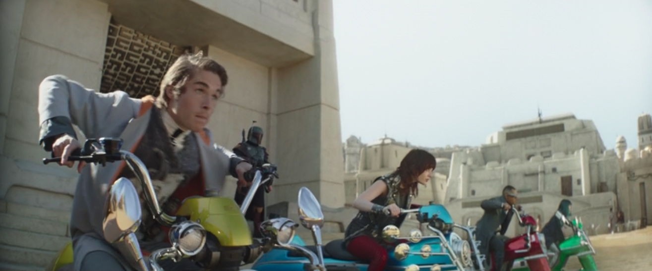 Even though I enjoyed the action scenes in Rodriguez’s The Mandalorian episode “Chapter 14: The Tragedy” (and even more impressive that he was brought in on short notice), the action during his episodes has been lacking. Watching a thrilling train sequence and then following up with a weird go-cart race through Mos Espa killed some momentum from this show because we are probably not going to see another train scene, but we will see those absurdly colorful bikes again.