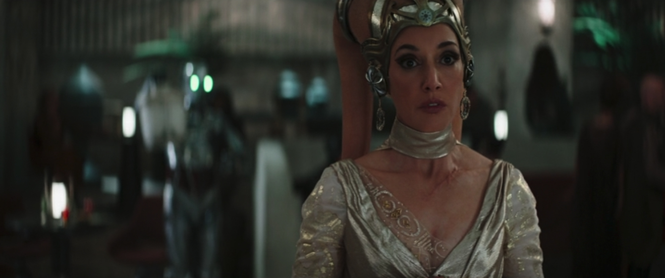 This deserves some dedicated time to discuss. Jennifer Beals’ Garsa Fwip has now had to deal with Boba coming in, the Hutts laying claim, and Black Krrsantan making a mess of Trandoshans in her establishment. All with limited screen time, but still with her star power shining through. And that all seems to go out the door this episode with no dialogue from Beals, just looks.