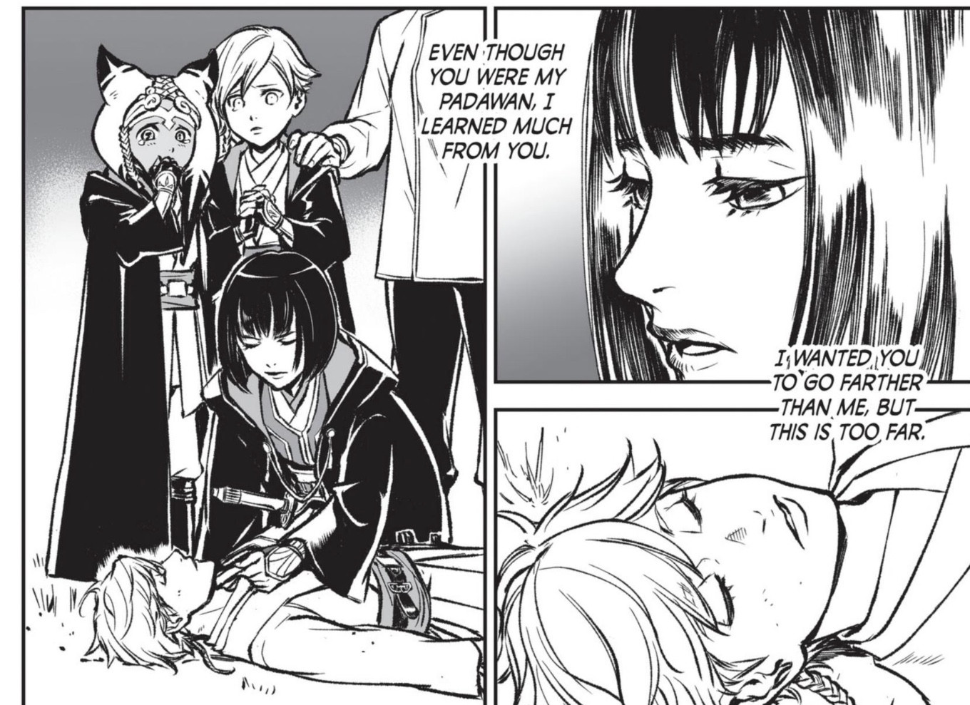 Speaking of surprises, Sav’s role as a foil for Lily’s rigidness fits the theme of Star Wars and balance. Learning from her experiences portrayed in The High Republic Adventures, she challenges Lily to adapt to the threat of the Nihil and attachments to the temple because ultimately, it is the people who matter. Sav’s advice for Lily in her time of grief makes me wonder how many Padawans she has lost in her centuries of being a Jedi. Perhaps Sav will get her own comic or manga as she has been set up as second mentor to Lily.