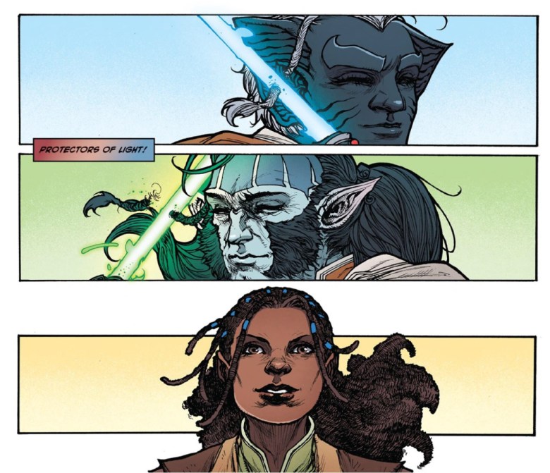 Even though we last saw Lula in the last issue of The High Republic Adventures, she was referenced post-Starlight fall by Zeen, who claims that she would sense Lula’s death in Midnight Horizon. There are unresolved issues between Zeen and Lula as they confessed their feelings for each other before Zeen left for Corellia. But sometimes, in life, things are left unresolved. However, I do not think this is the case with Lula (though I would respect the decision if she is dead). Lula had a breakthrough in her journey to become a Jedi Knight. From her introduction in The High Republic Adventures # 1, she has only ever wanted to be the greatest Jedi ever, and being knighted young is a part of that. But she understands that she needs to face her feelings toward Zeen before that step.