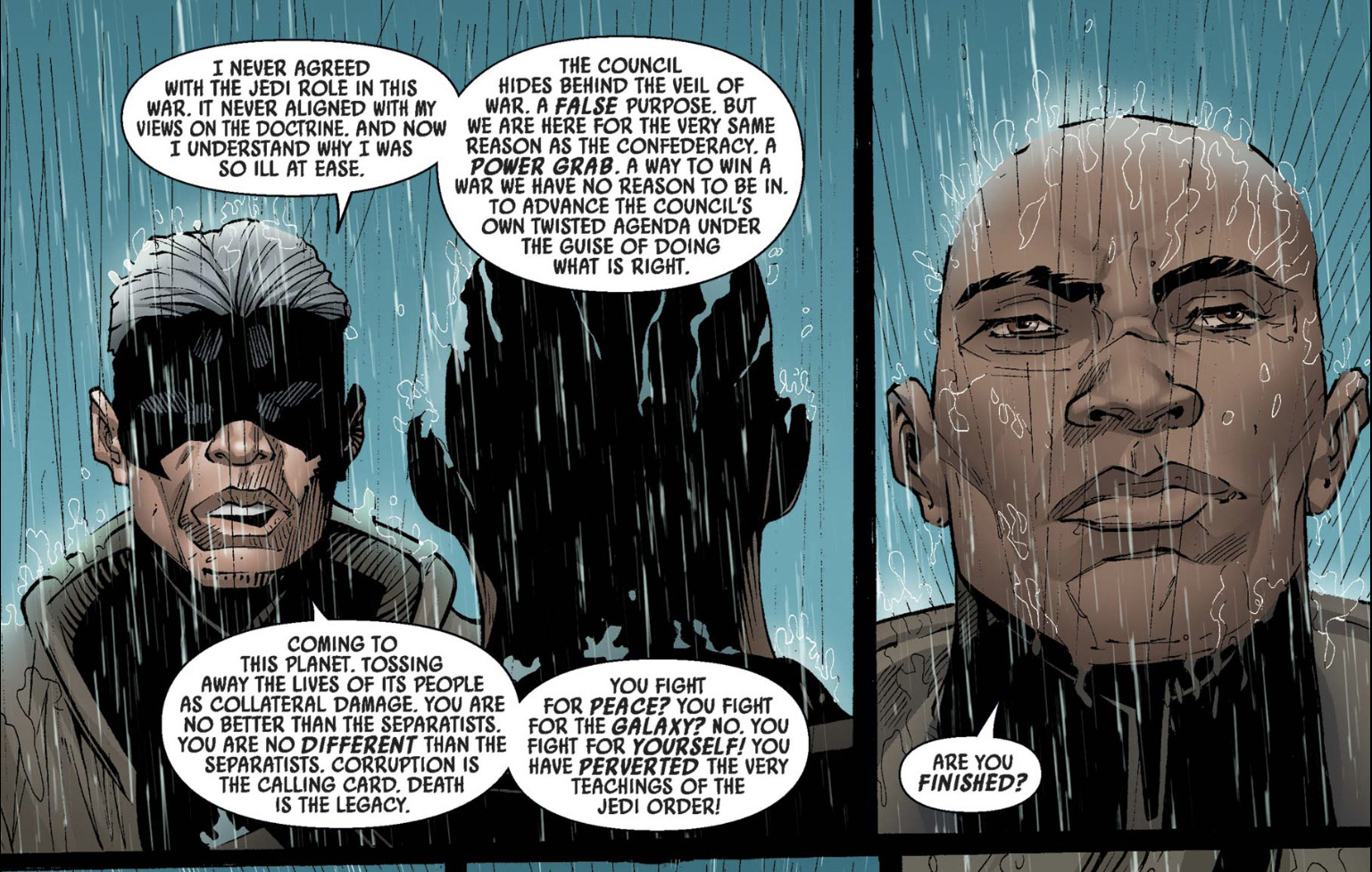 The role of the Jedi has changed, leading armies into battle. Is this their place? If peace is the ends, are the means justified? Are they on the right side of said peace? These are the kind of soul-searching questions Mace will have to dig deep and answer for himself.”