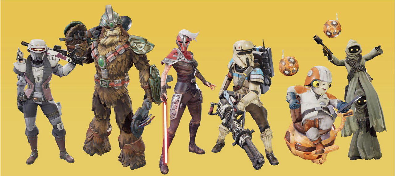 Star Wars: Hunters takes place after the Galactic Civil War on the Outer Rim planet of Vespaara. Each player has unique skills and damage outputs that make them suitable for specific roles in gameplay. Players must pick three types of fighters (Damage, Support, and Tank) to build a winning team. Within the game, there are three game modes: