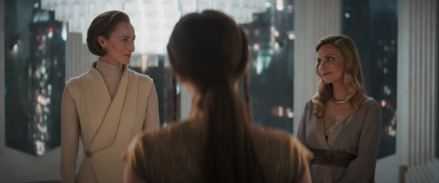 We finally learn about Vel’s family background. It turns out she is a Mothma. Her driver tells Mon Mothma that her cousin came to visit, and the Senator arrives home from a dreadful day being yelled at on the Senate floor to see Leida gushing over what “Aunt Vel” brought her.