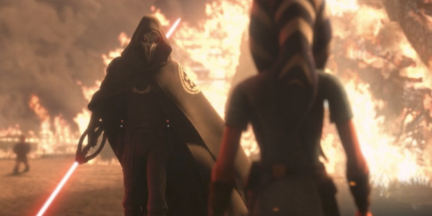 Sometime later, Ahsoka is working on a farm when she outs herself as a former Jedi when she decides to save a young woman from death by hay bales. The brother, an Imperial sympathizer, alerts the Empire and brings an Inquisitor to the village. Shockingly, the Inquisitor rewards the brother by burning down their village, not seeing the Jedi he was promised. Ahsoka comes in to save the day but not before the Inquisitor recognizes her and comments that she’s supposed to be dead. That could tie into the finale of The Clone Wars, where Vader finds Ahsoka’s lightsabers in the snow. We did not get any dialogue or insight into what Vader was thinking, but it is not farfetched that he assumed she was dead (which is confirmed in Rebels). Naturally, the Inquisitor (the Sixth Brother in the novel but only named Inquisitor in the credits) has to die. The family has to be relocated, which leads to the reconnection with Bail Organa and her joining the Rebellion.