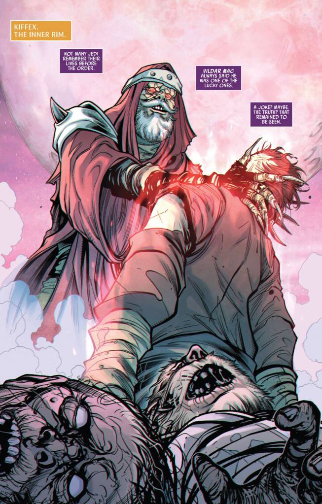If you are a canon junkie, this issue starts with a curve ball. We are on Kiffex, an only briefly mentioned planet in “You Owe Me A Ride” from the collection of short stories, A Certain Point of View. And our main character, Vildar Mac, is a Kiffar. It is the first time we have had a Kiffar character since Quinlan Vos, who has come a long way in popularity since a background appearance in The Phantom Menace.