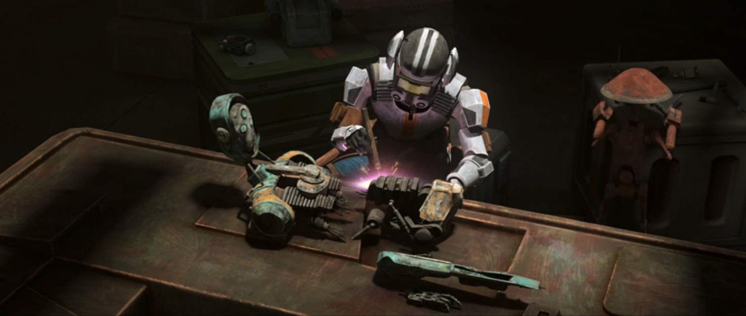Since season one, Tech has been the best at adapting to their changing situations, making him one of the most rounded members of the Bad Batch. While Hunter is focused on doing right by Omega and Echo by doing right by the galaxy (we have no idea what Wrecker’s motivations are), Tech has been the most willing to try different things in the best interest of the team. Here, Tech has analyzed the racing course and is confident to step into the speeder and play to win.