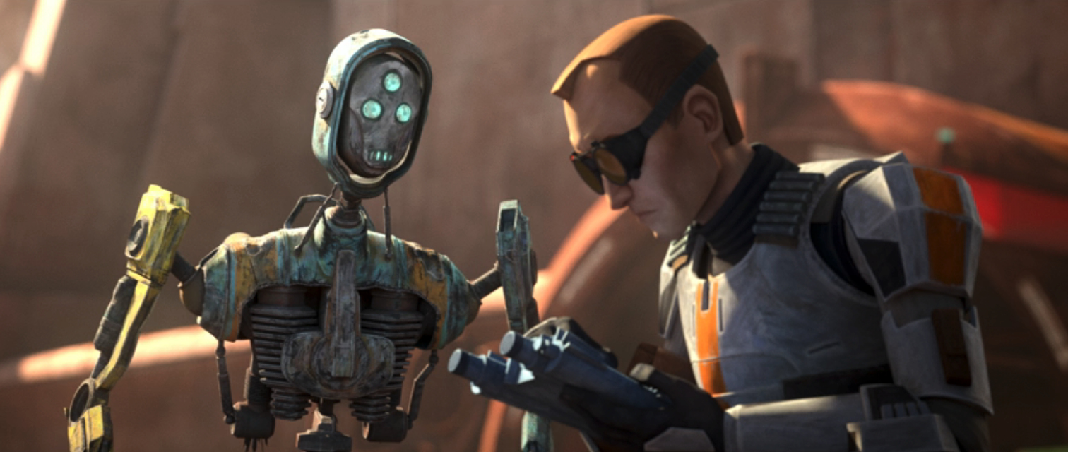 Comedy is difficult to balance in any genre, but with Star Wars, it has come primarily on slapstick humor involving droids, aliens, or a designated comic-relief character. “Faster” does have the droids, the aliens, and the Bad Batch member most associated with slapstick comedy (Wrecker). But writer Matt Michnovetz doesn’t overdo it with any of the elements (ala George Lucas in The Phantom Menace). And the reward is a nice blend of action, comedy, and potential foreshadowing of a dark turn for the series. But let’s return to the comedy anchored by two characters. The first is droid TAY-0 (an instantly recognizable Ben Schwartz, voice of film Sonic), who is far more confident in his racing abilities than he should be. This causes plenty of problems for poor Tech, Omega, and Wrecker. And the second character is someone we never see but hear: the announcer of the race (voiced by Jonathan Lipow, a prominent video game VO artist).