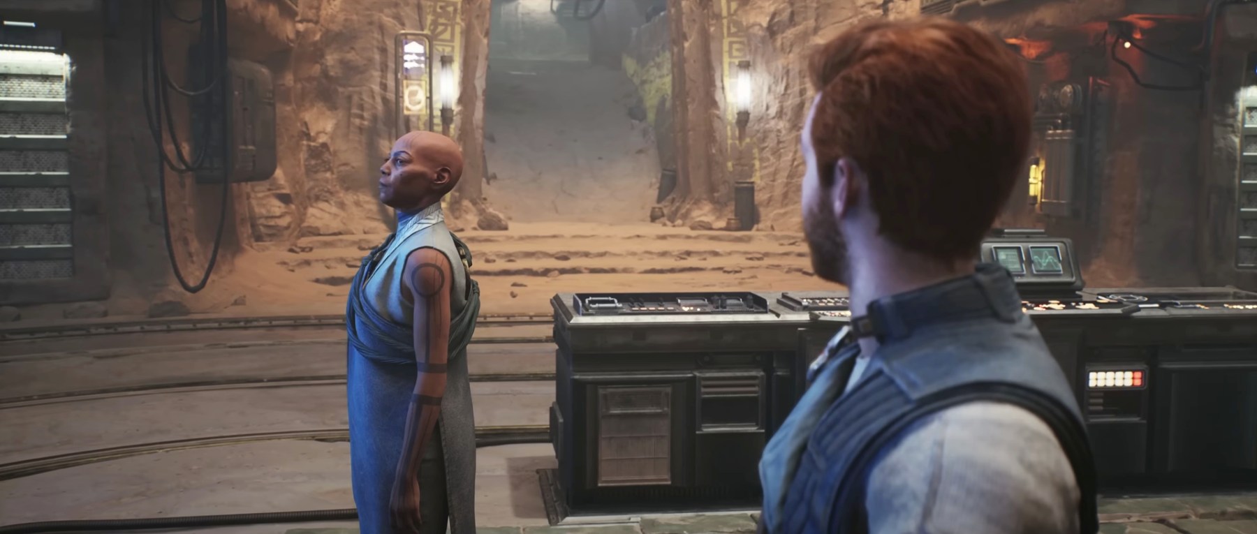 The bright spot is the dynamic between Cal, Cere, and Greez, with Cere at the center. Cal and Cere were brought together in the first game when the latter saved the former from the second sister (aka her former Padawan Trilla). However, their priorities have drifted apart since destroying the Holocron with the names of Force-sensitive children.