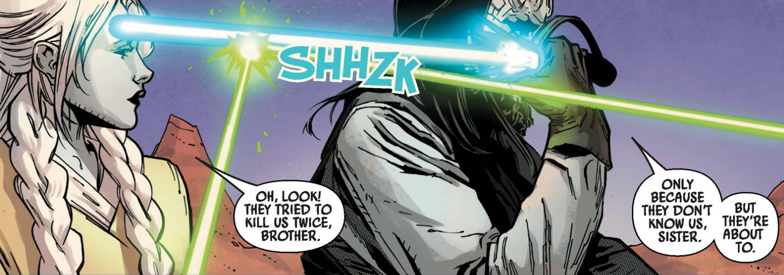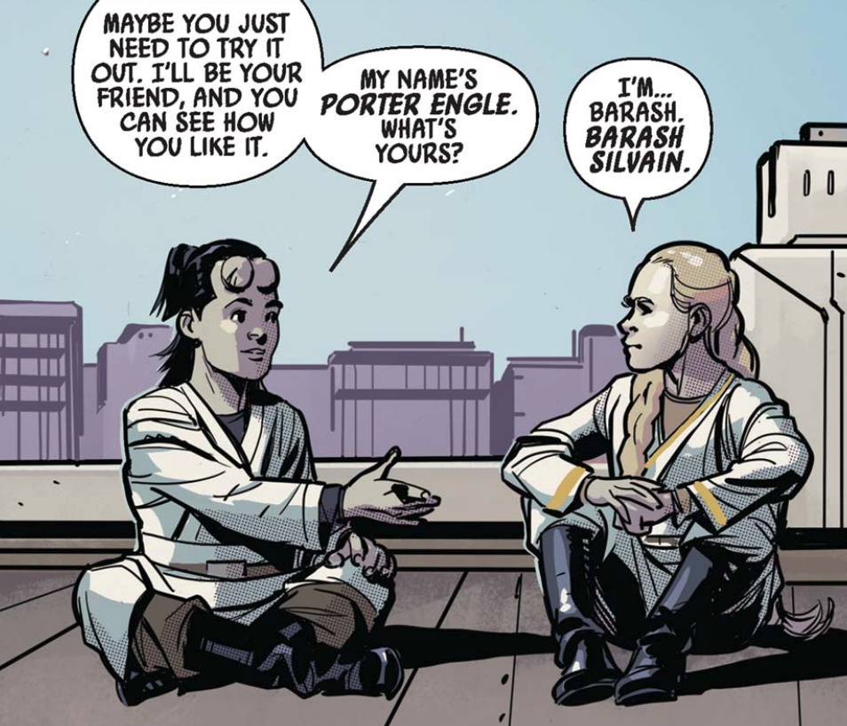 Porter appears front and center and is the sole figure on every issue, but this is just as much Barash’s story. Being a Kage, she remembers her early childhood, including her family of brothers and sisters, before the Jedi Order took her. Highlighting the reality that most Jedi never remember their biological families, this immediately endears the reader to Barash, and we understand why she asks Porter to be her brother. However, this attachment concerns the Order enough to attempt to separate the two as Padawans. The two figure out a way around that but good things always come to an end (as Barash reminds Porter that Kage do not live as long as Ikkrukkians). She certainly is not around during the events of Phase One.
