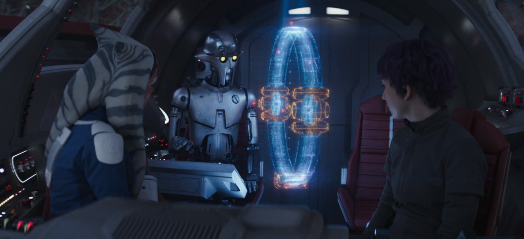The lesson in anticipation does come full circle, from the training session to a dog fight with Shin, Marrok, and Morgan. A squadron led by Shin immediately attacks Ahsoka’s ship when it comes out of hyperspace. They take out some red shirts, but part of the ship and Huyang get temporarily taken out while trying to get a full scan of the hyperspace ring (Eye of Sion).