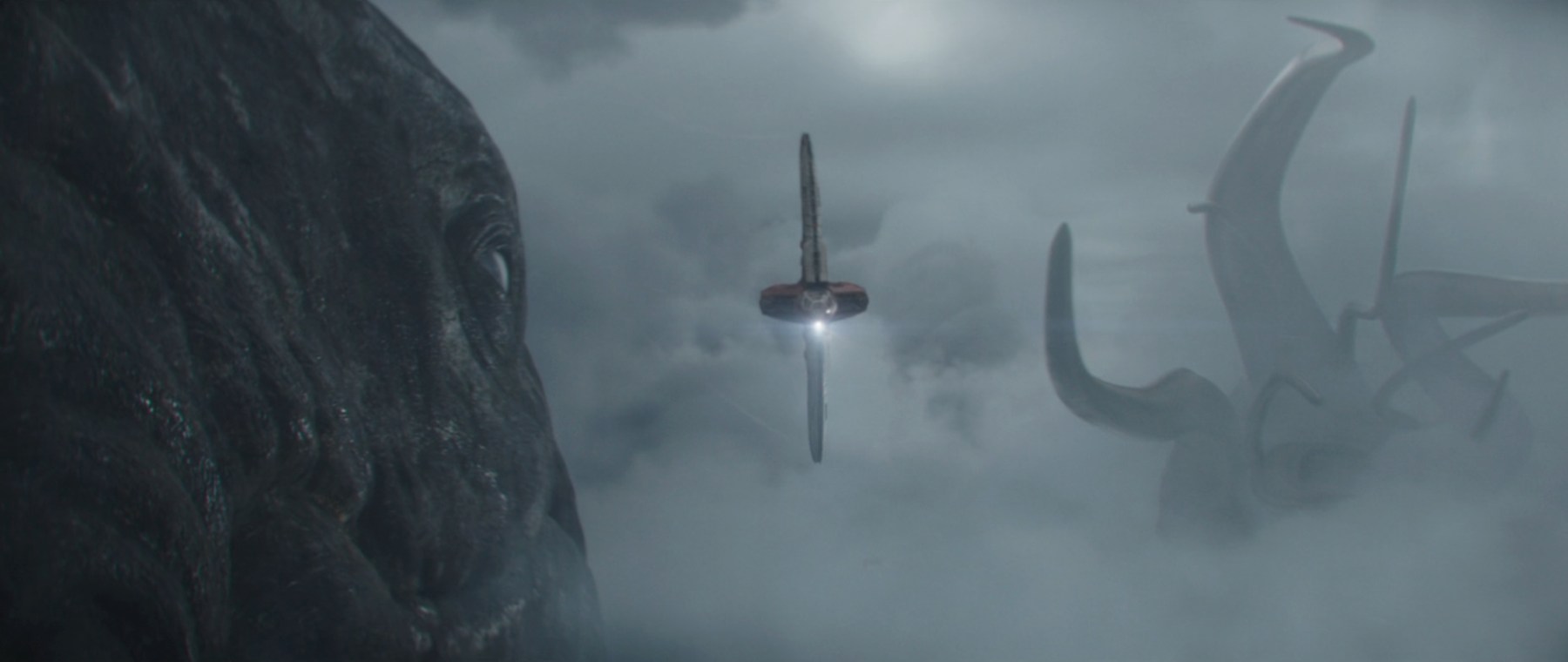 But let’s discuss the true stars of the episode! A great payoff to the silhouettes in The Mandalorian and the sounds in “Toil and Trouble,” the Purrgil (aka Space Whales) have arrived and have translated beautifully from animation. And what a set piece to introduce them! Ahsoka and Sabine have to dodge blaster fire and whales as they make their way through the atmosphere of Seatos. Sabine makes the connection (for non-Rebel watchers) that the Purrgil were involved in Thrawn and Ezra’s disappearance. At the same time, Huyang (awake from his involuntary nap) tells them that the Eye of Sion could have the power to jump galaxies like the Purrgils. All hope is not lost as the hyperspace ring is not yet complete, which might give the team enough time to rally another fight, even though we will see Thrawn and Ezra.