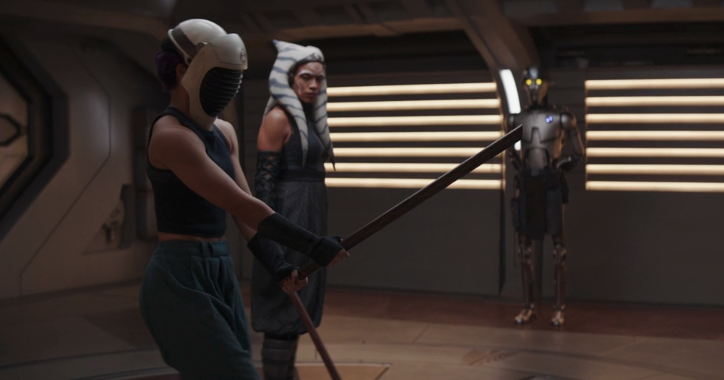 Green’s second episode picks up where her last one left off, with Ahsoka, Sabine, and Huyang heading to the Denab system in hyperspace. Huyang is training Sabine in fight basics when Ahsoka takes a different approach. She gives Sabine a Jedi training helmet, impairing her vision and enhancing her hearing and other senses in a neat sequence that is the most engaging fight we have gotten (The technique is called Zatochi).