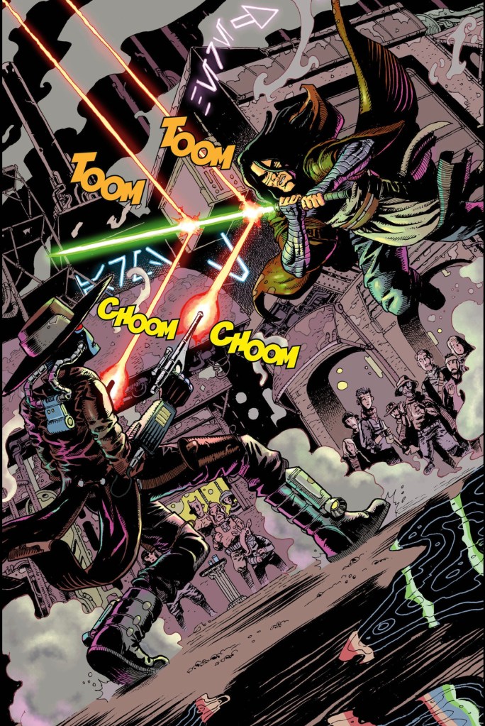 Vos gets the better of Bane and escapes with Eckt but learns that the Serrenian also stole some of Dooku’s treasure, which he stashed in a junkyard on the planet. Vos goes in alone to retrieve the treasure and intel, but a group of bounty hunters and Bane confront him. Vos distracts them by throwing the treasure on a conveyor belt so he can flee; however, Bane does not take the bait, following Vos to get Eckt first. Once again, Vos defeats Bane and escapes with Eckt in a junkyard ship.
