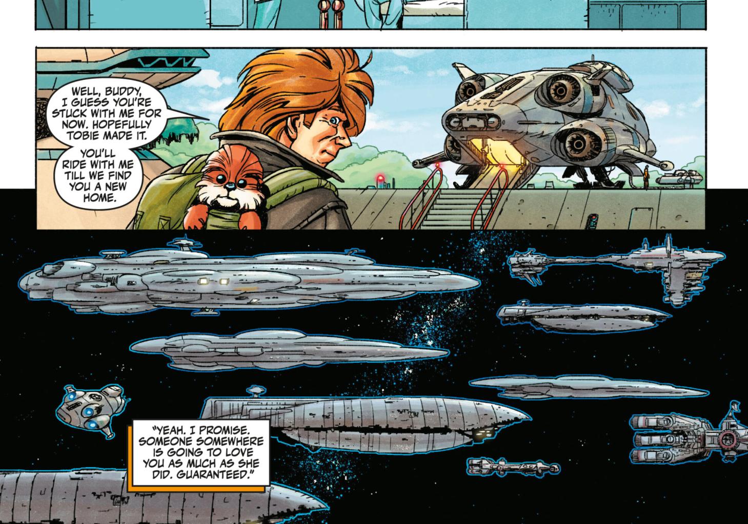 With the Battle of Endor condensed to three pages, this story belongs to Basch. “The Little Things” is the only story where a background character gets the main storyline. Basch first appeared in that Battle of Endor sequence in Return of the Jedi, but the character is only on screen for a short time, which gave writer Cecil Castelluca a blank slate to build a character arc.