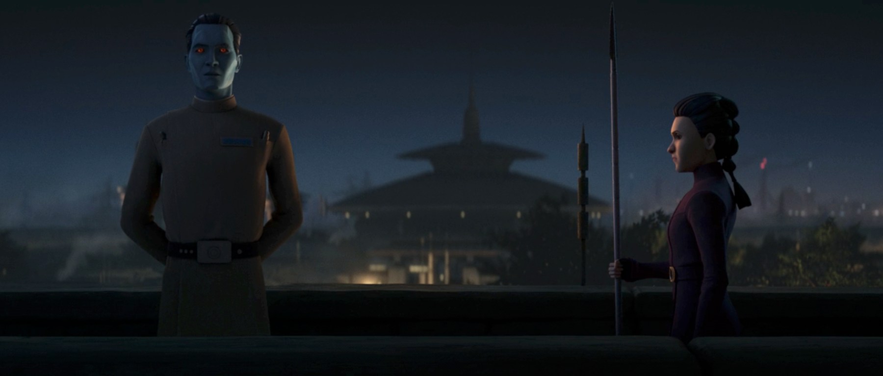 Morgan and Barriss also have a moment in their second episode where they are conversing with a potential friend or possible foe after a brutal fight scene: Morgan with Thrawn and Barriss with the Fourth Sister. Thrawn sells Morgan on his vision for the Empire, eradicating the “sickness” of the Rebellion and how she could fit into that vision. The Fourth Sister tries to convince Barriss that leaving a Jedi behind to die does not matter because the Jedi should “be eradicated wherever they are found.”